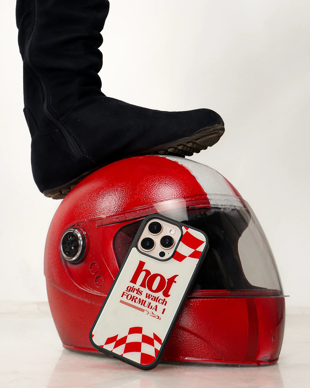 A stylish and protective Racing-themed iPhone case featuring bold red typography and a retro checkered-flag design. Perfect for F1 fans looking for a trendy, minimal streetwear accessory. Lightweight, durable, and printed in high definition, this “Hot Girls Watch F1” phone case adds personality and motorsport flair to your everyday look.